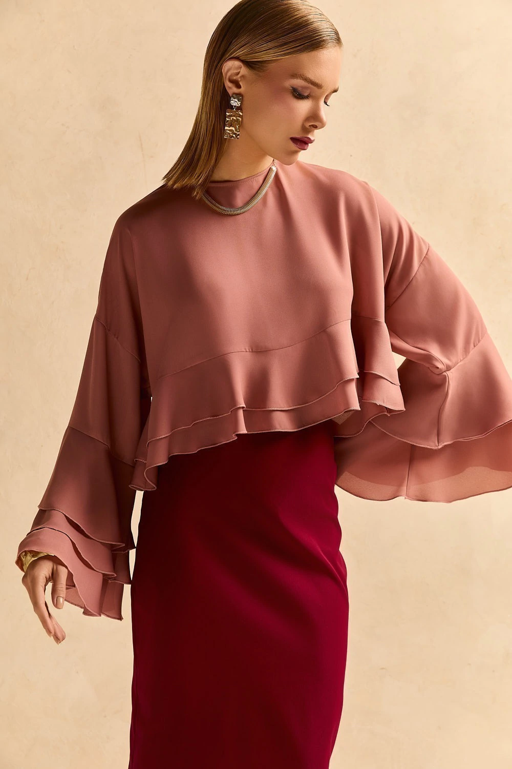 Seu corte fluido e mangas longas com babados criam uma silhueta leve e delicada, ideal para ocasiões que pedem um visual sofisticado sem abrir mão do conforto. O tom rose suave adiciona uma dose de romantismo e versatilidade, permitindo combinações com diferentes estilos de saias e calças.
